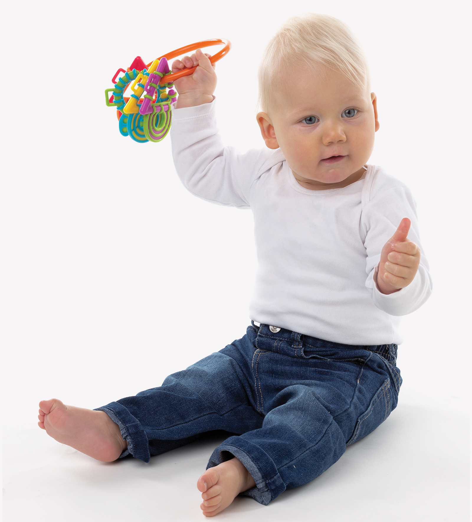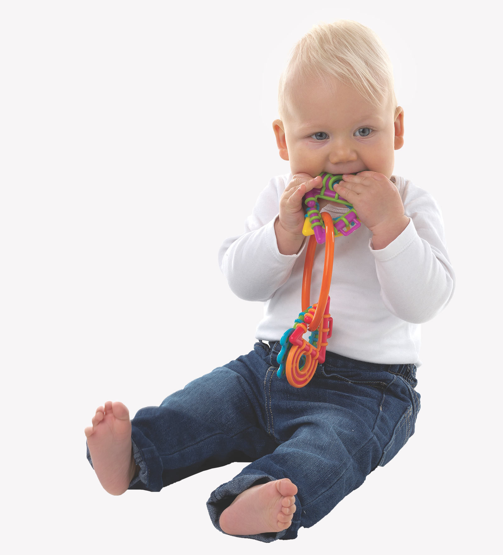Link me up and take me with you! These brightly coloured Teething Links attach easily to most strollers, play gyms and car seats. With textured surfaces, the detachable chewy links are ideal for soothing those tender gums and on a large carry ring, are easy for little hands to grasp.